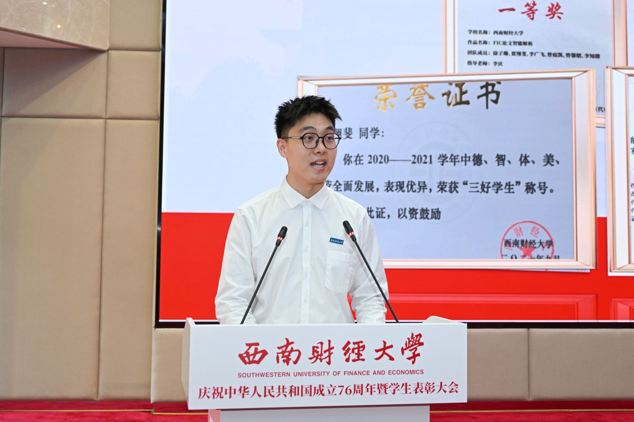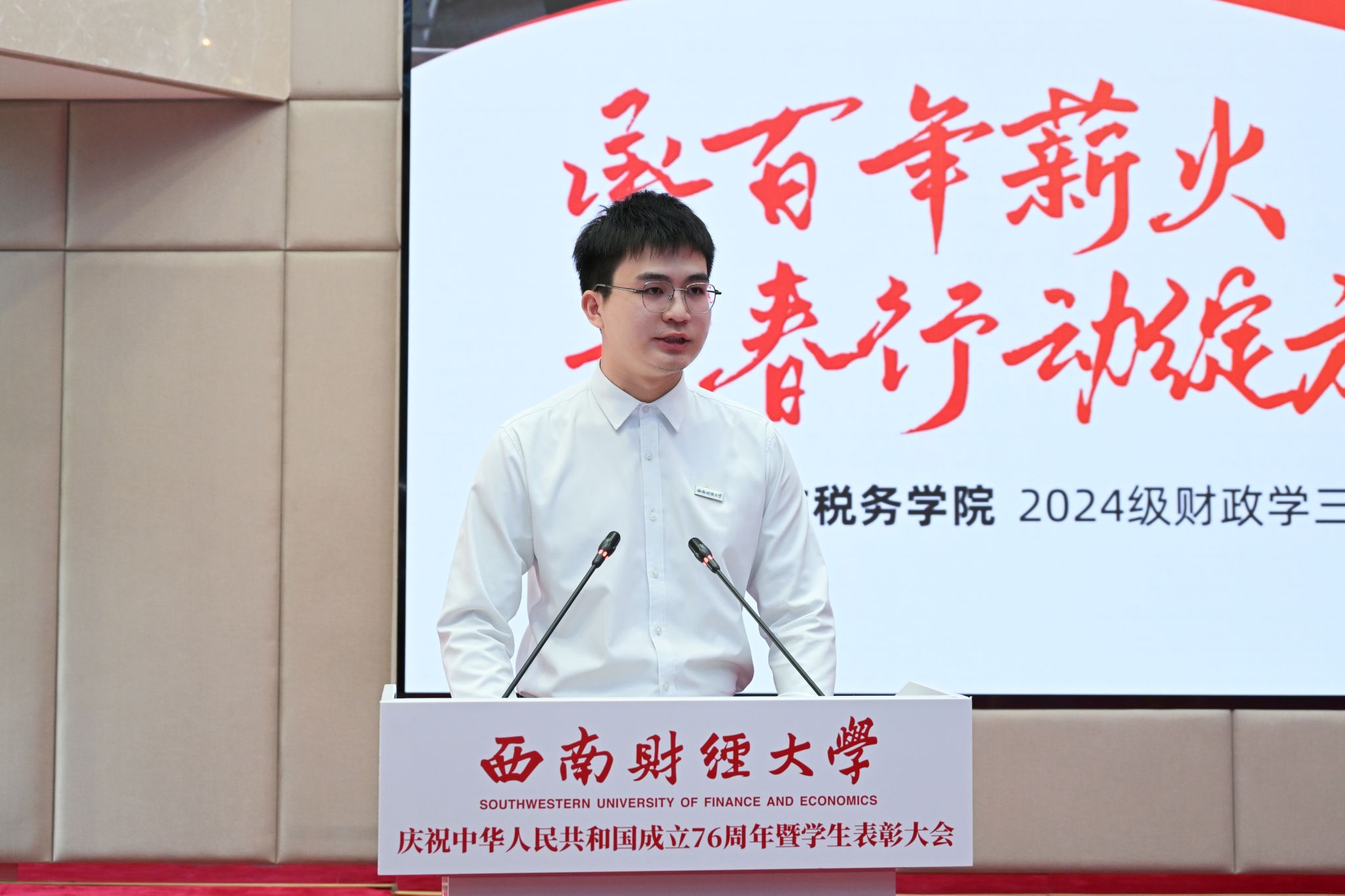 受表彰三好学生代表贾翔斐、优秀学生干部代表杨景茹、先进班集体学生代表叶彦炫结合自身学习生活经历分享交流先进事迹,号召广大西财青年传承“经世济民、孜孜以求”大学精神,把个人理想融入民族复兴的伟大征程,以实际行动为中国式现代化贡献青春力量。