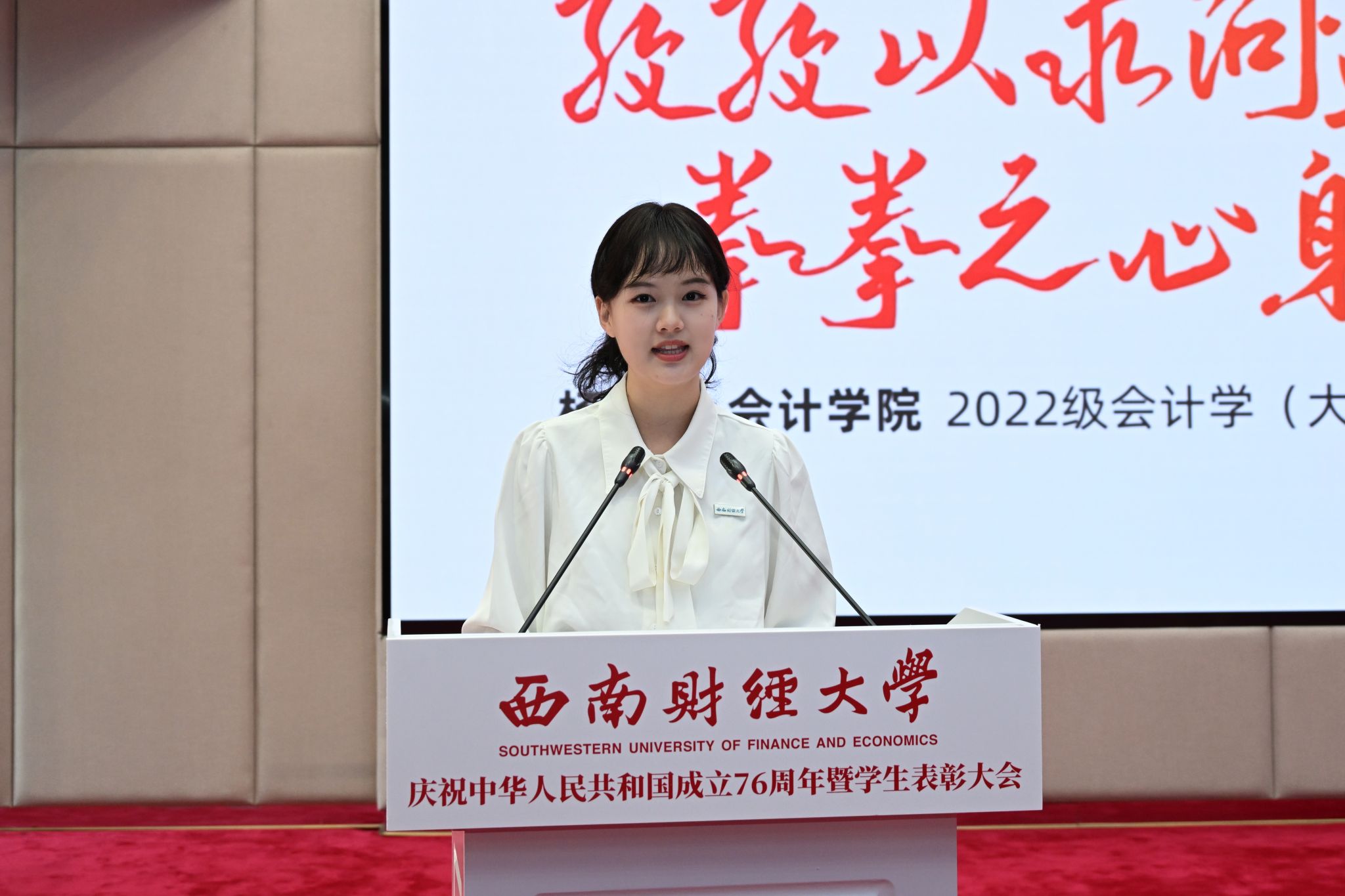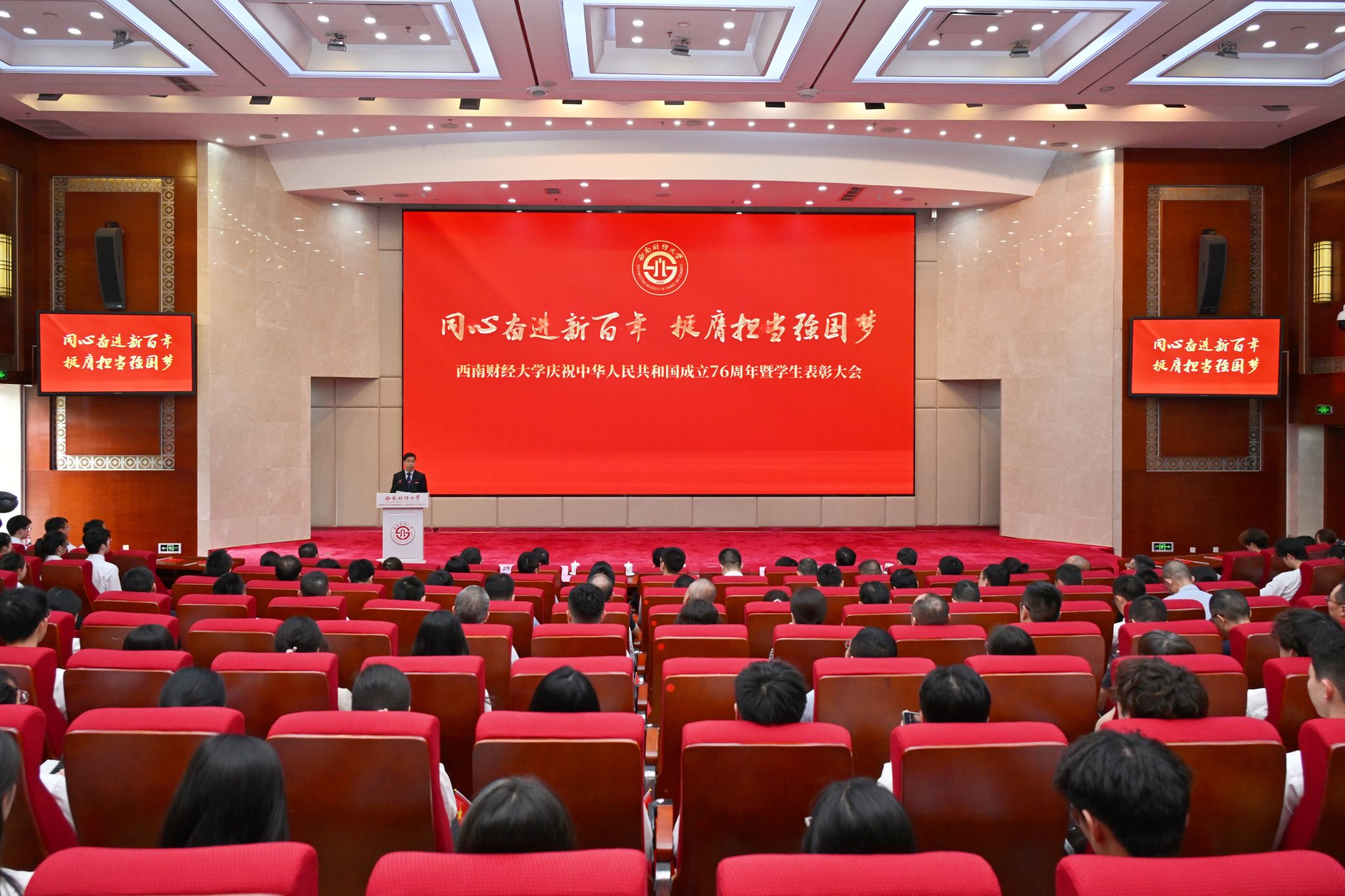 党委书记赵建军代表学校向全校师生员工致以节日问候,向受到表彰的先进学生集体和优秀学生个人表示热烈祝贺。他指出,新中国成立76年来,中国共产党带领全国各族人民同心同德、自立自强,新中国日益走近世界舞台中央、中华民族伟大复兴迎来光明前景。西南财大始终紧跟国家发展战略、紧扣教育发展机遇、紧贴时代发展脉搏,担当奋进,集聚起面向新百年、开启新征程、迈向新起点的坚实底气。