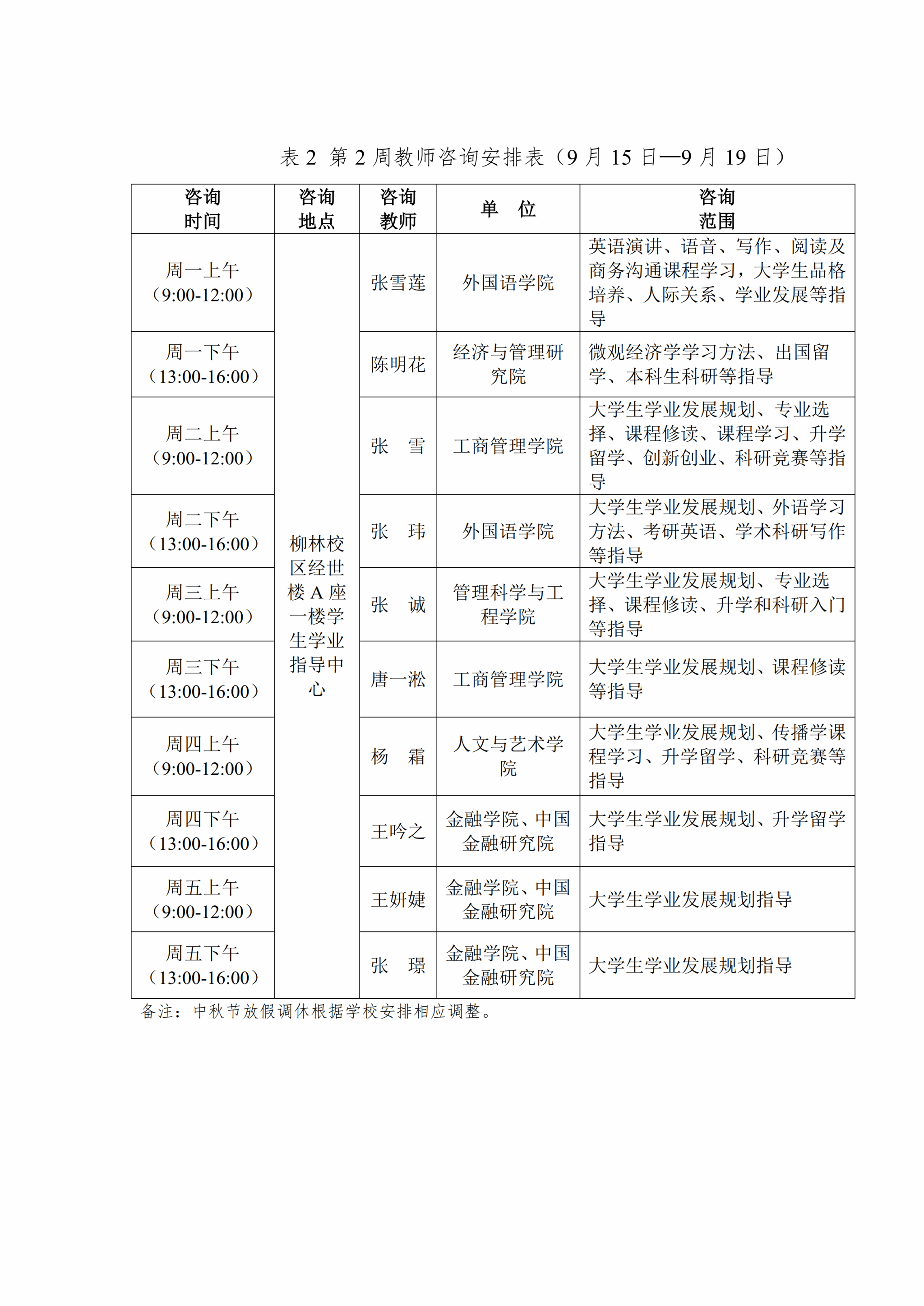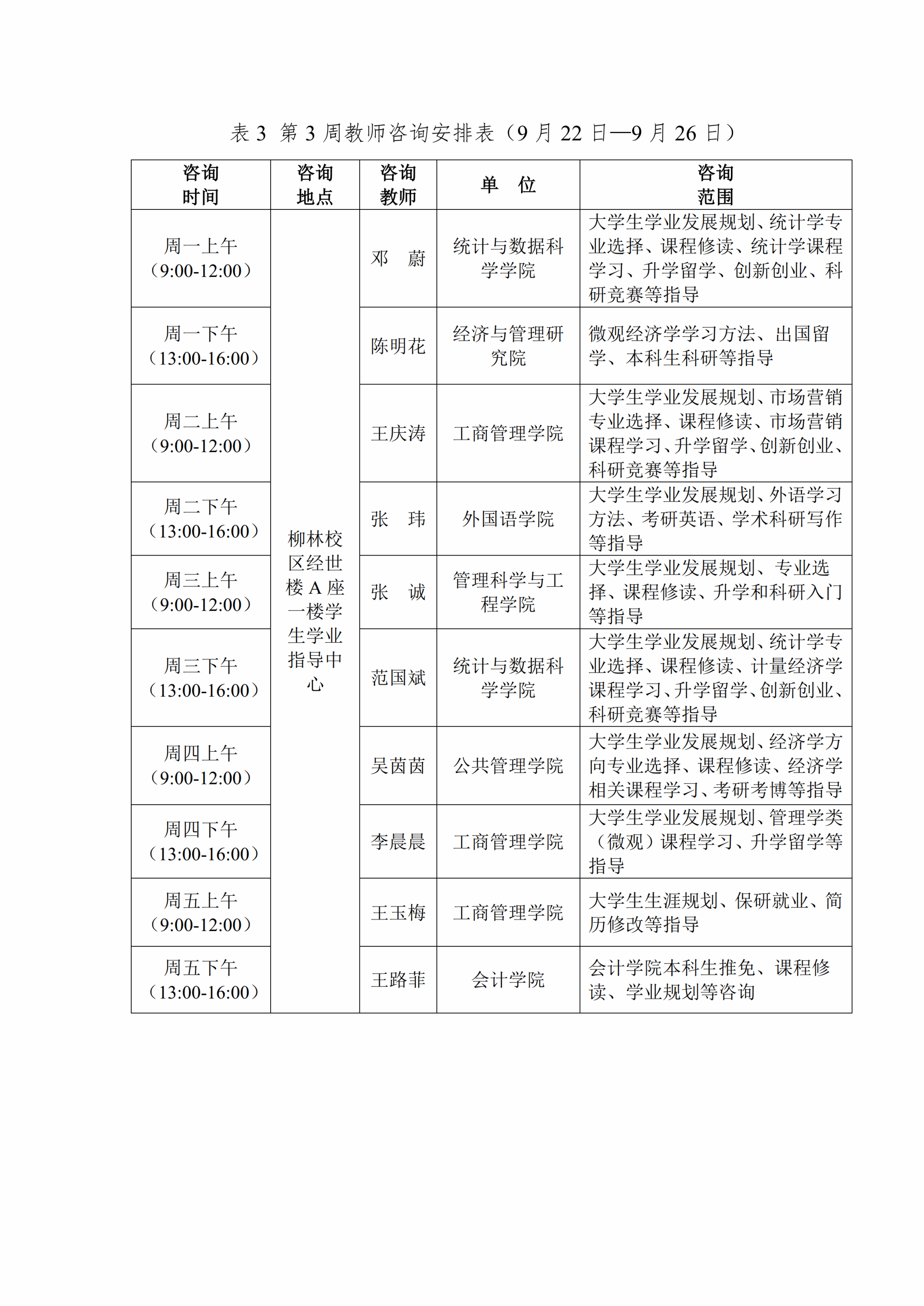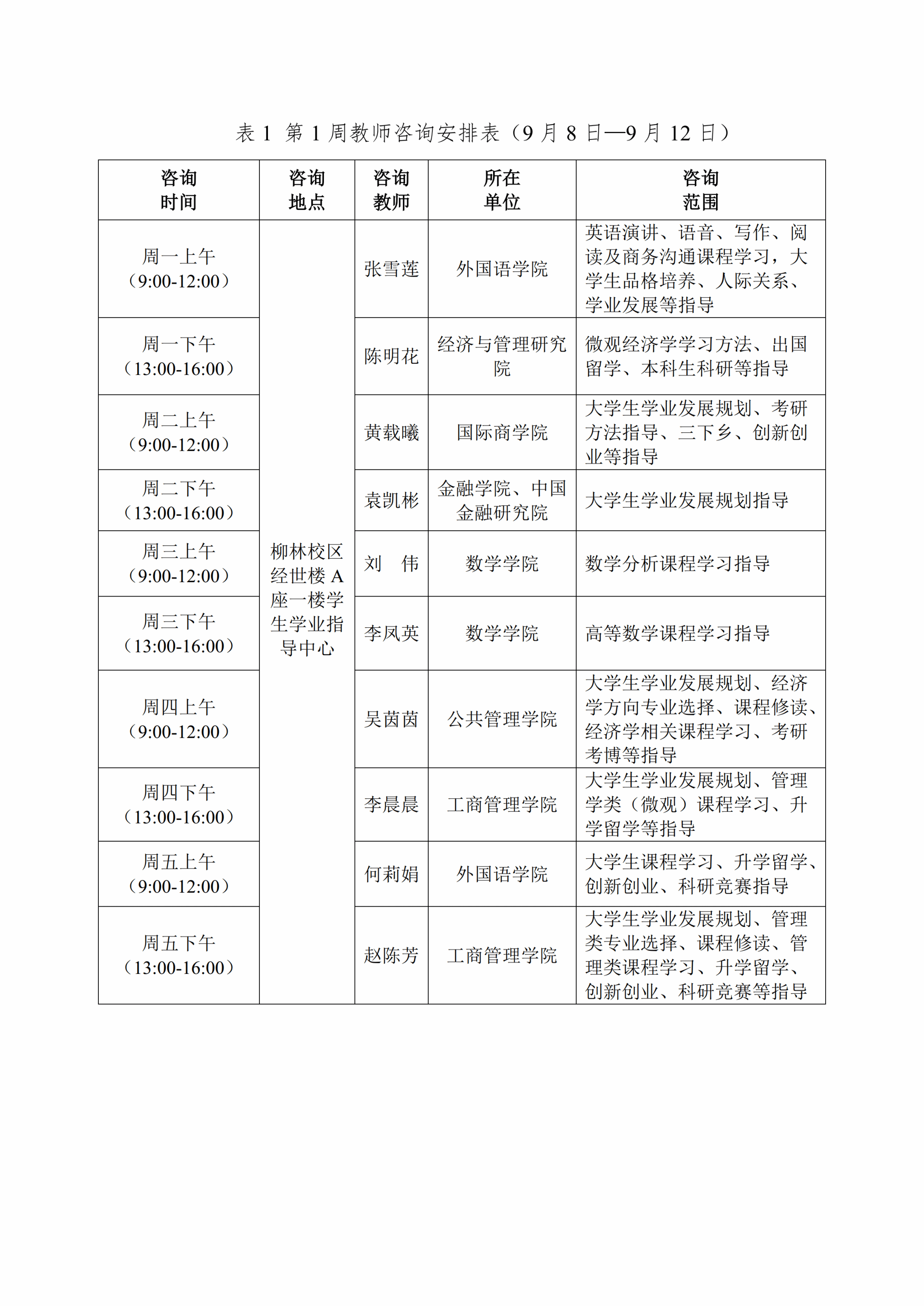 为推进课程教学范式深彻转变,促进同学们学习理念、习惯、方式与时俱进,丰富大家在校学习体验,提供学科内容、学业流程等方面的咨询答疑,现将本学期第1至5周(9月8日—10月10日)教师咨询安排通知如下: