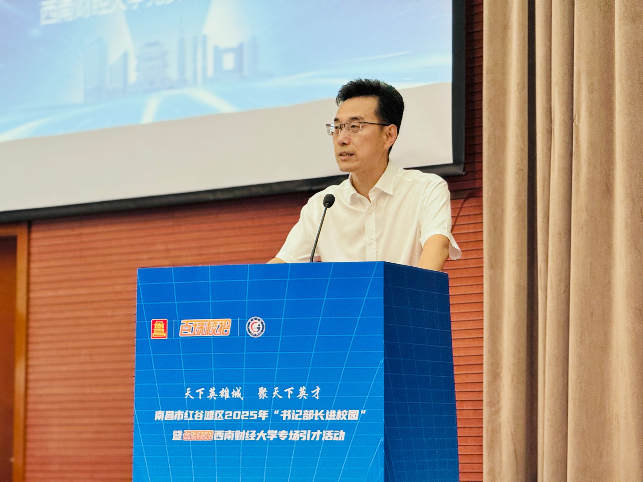 9月26日上午,南昌市“书记部长进校园”暨“百场校招”宣讲活动在我校柳林校区学生活动中心举办。学校党委常委、副校长盖凯程,南昌市红谷滩区委副书记、区长李婷出席活动并致辞。活动聚焦金融、数字经济等领域,汇聚了江西财经大学、中国联通江西分公司等20家重点企事业单位,带来大量优质岗位,吸引了200余名应届毕业生到场参与。